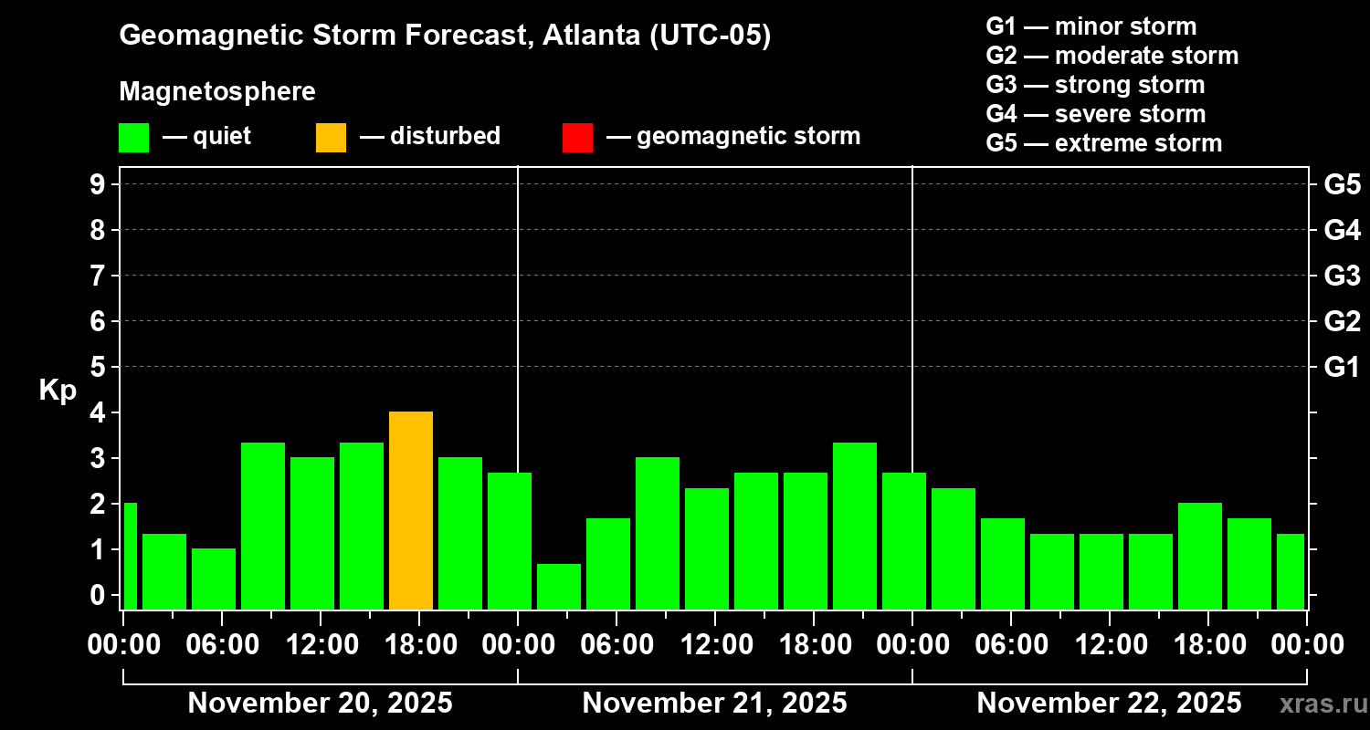 Geomagnetic storm forecast in Atlanta for Nov 20, 2025