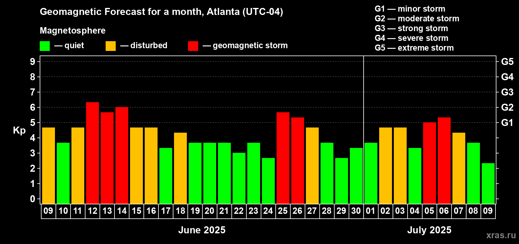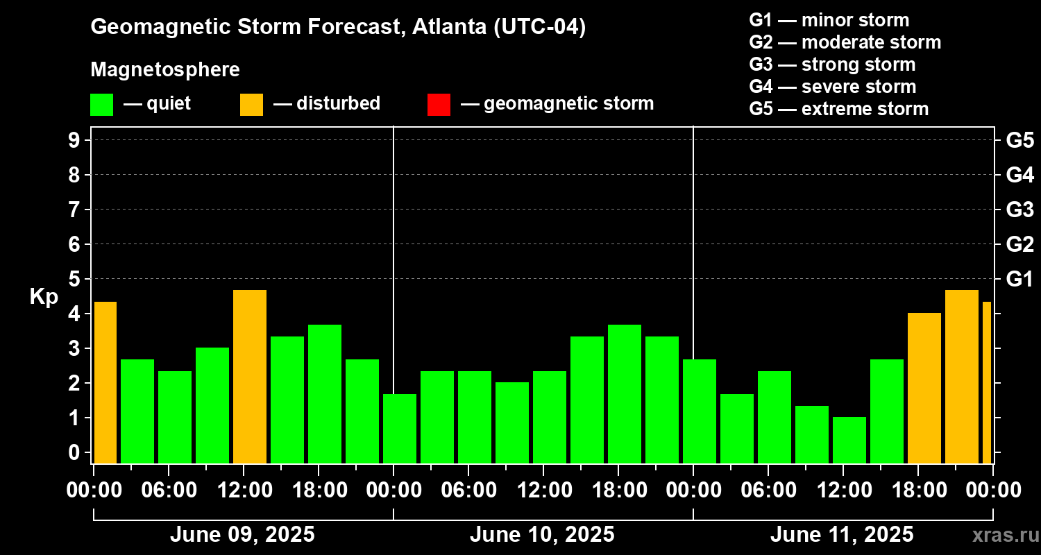 Geomagnetic storm forecast in Atlanta for Jun 09, 2025