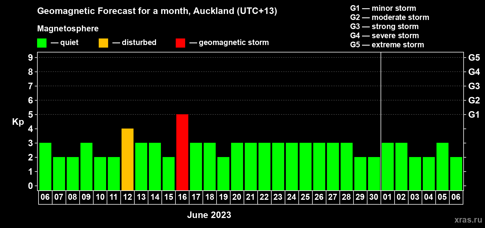 Geomagnetic storm forecast in Auckland for Jun 06, 2023