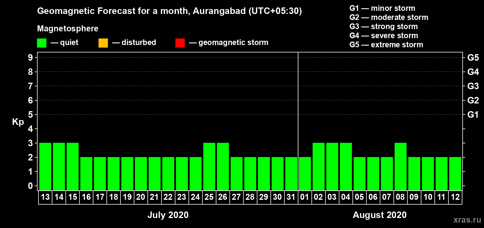 Geomagnetic storm forecast in Aurangabad for Jul 13, 2020