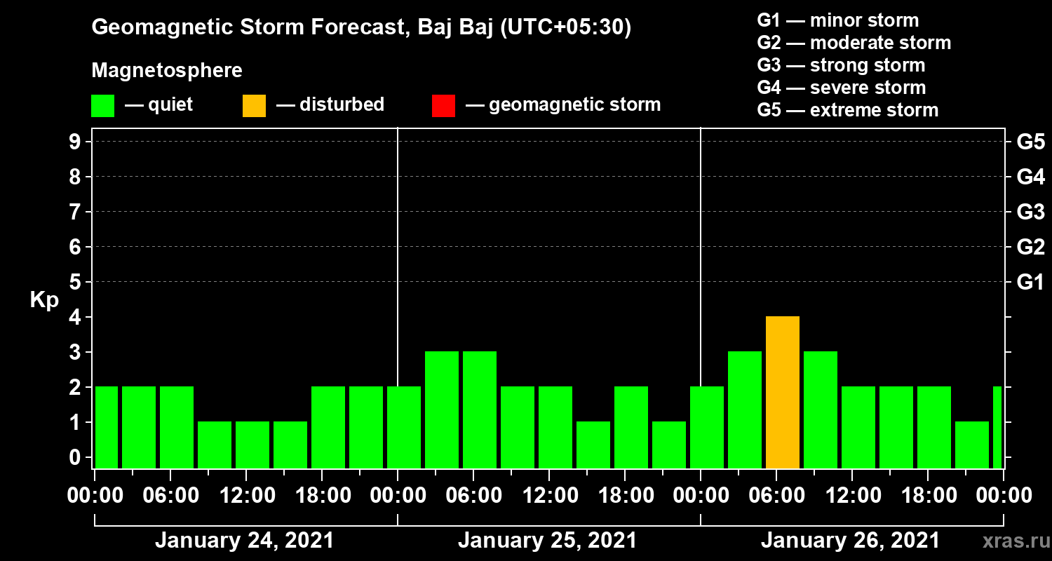 Geomagnetic storm forecast in Baj Baj for Jan 24, 2021