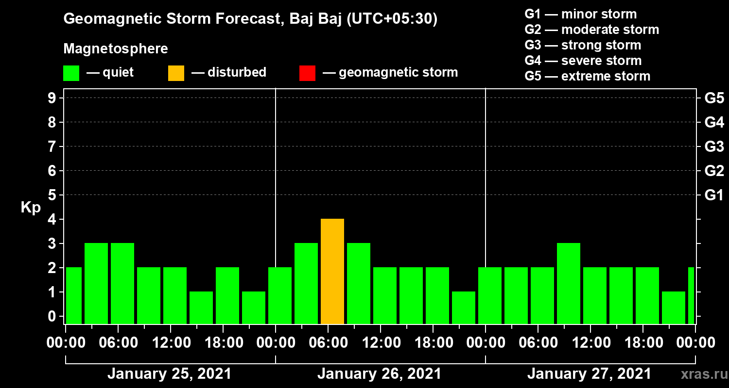 Geomagnetic storm forecast in Baj Baj for Jan 25, 2021
