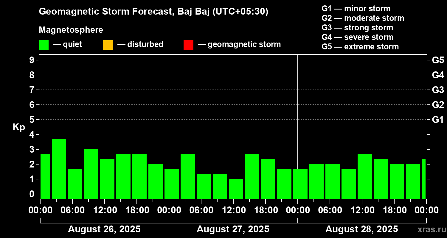 Geomagnetic storm forecast in Baj Baj for Aug 26, 2025