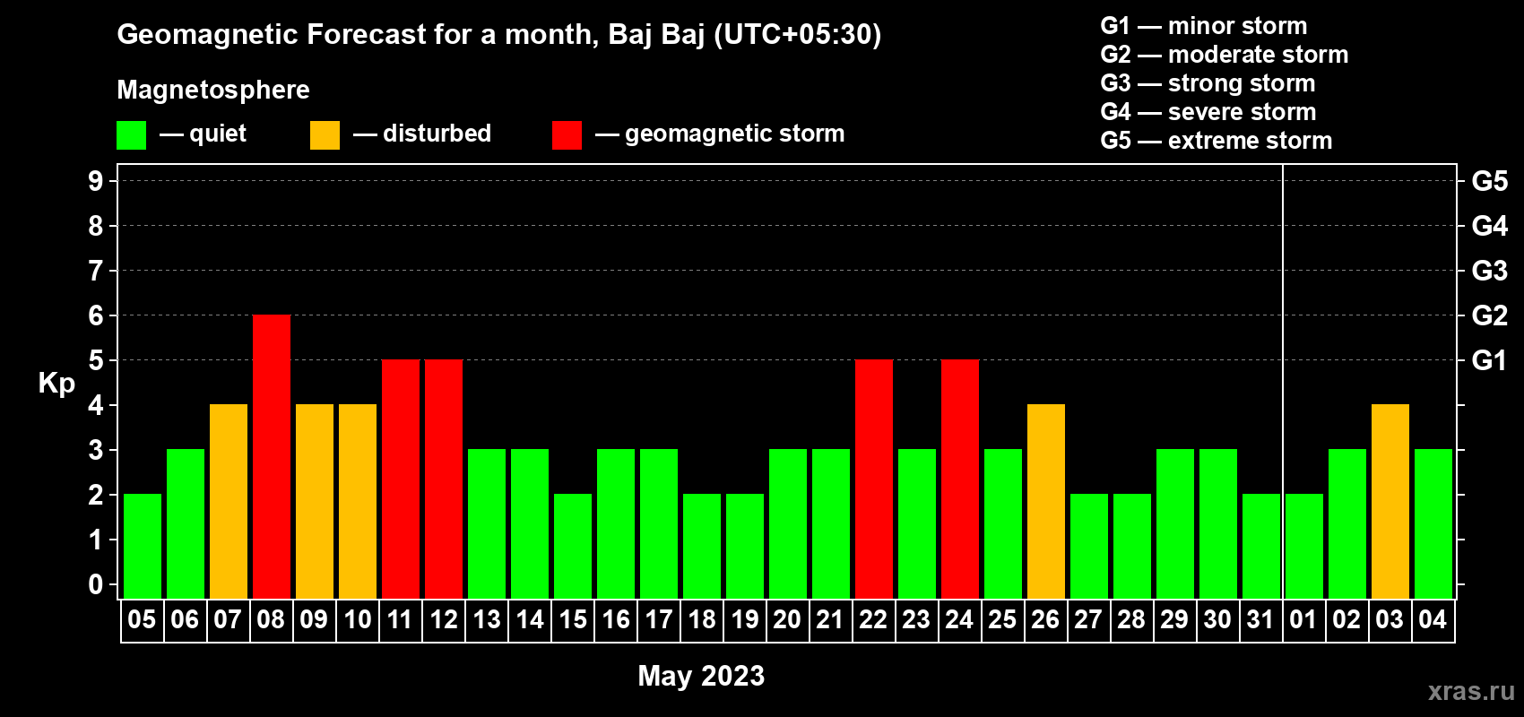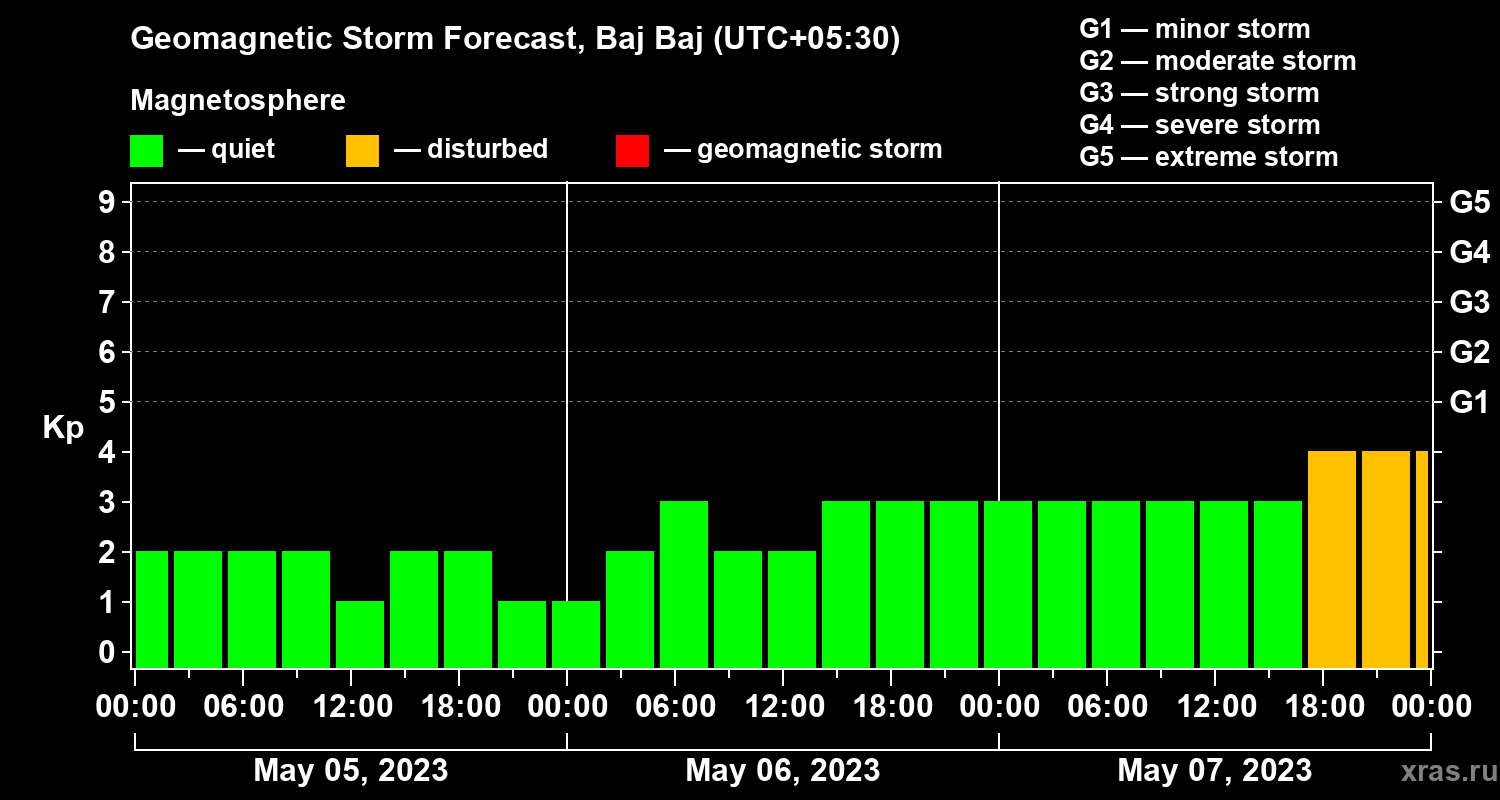 Geomagnetic storm forecast in Baj Baj for May 05, 2023