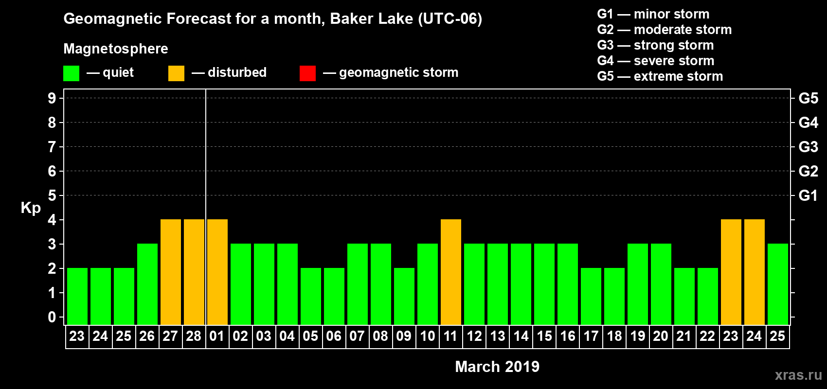 Geomagnetic storm forecast in Baker Lake for Feb 23, 2019