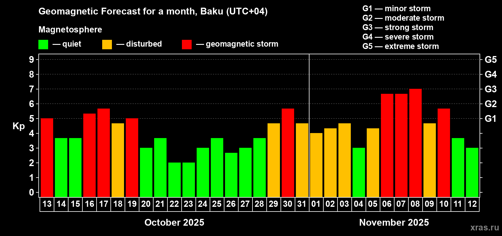 Geomagnetic storm forecast in Baku for Oct 13, 2025