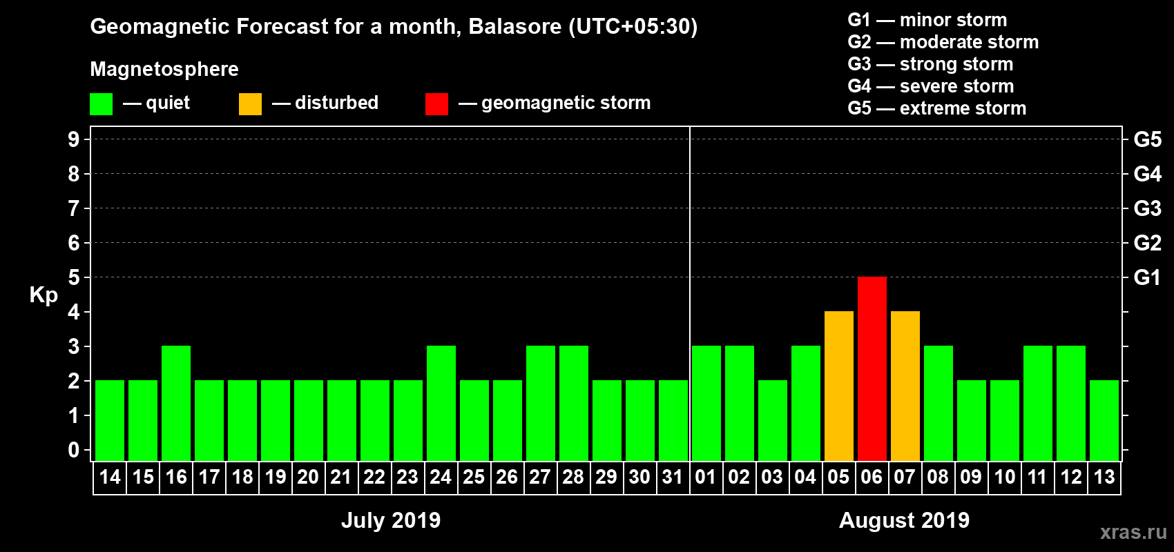 Geomagnetic storm forecast in Balasore for Jul 14, 2019