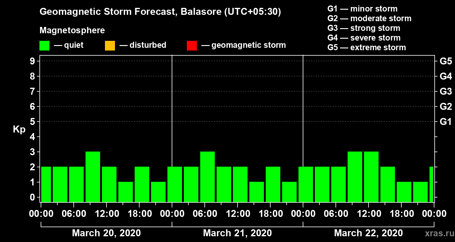 Geomagnetic storm forecast in Balasore for Mar 20, 2020