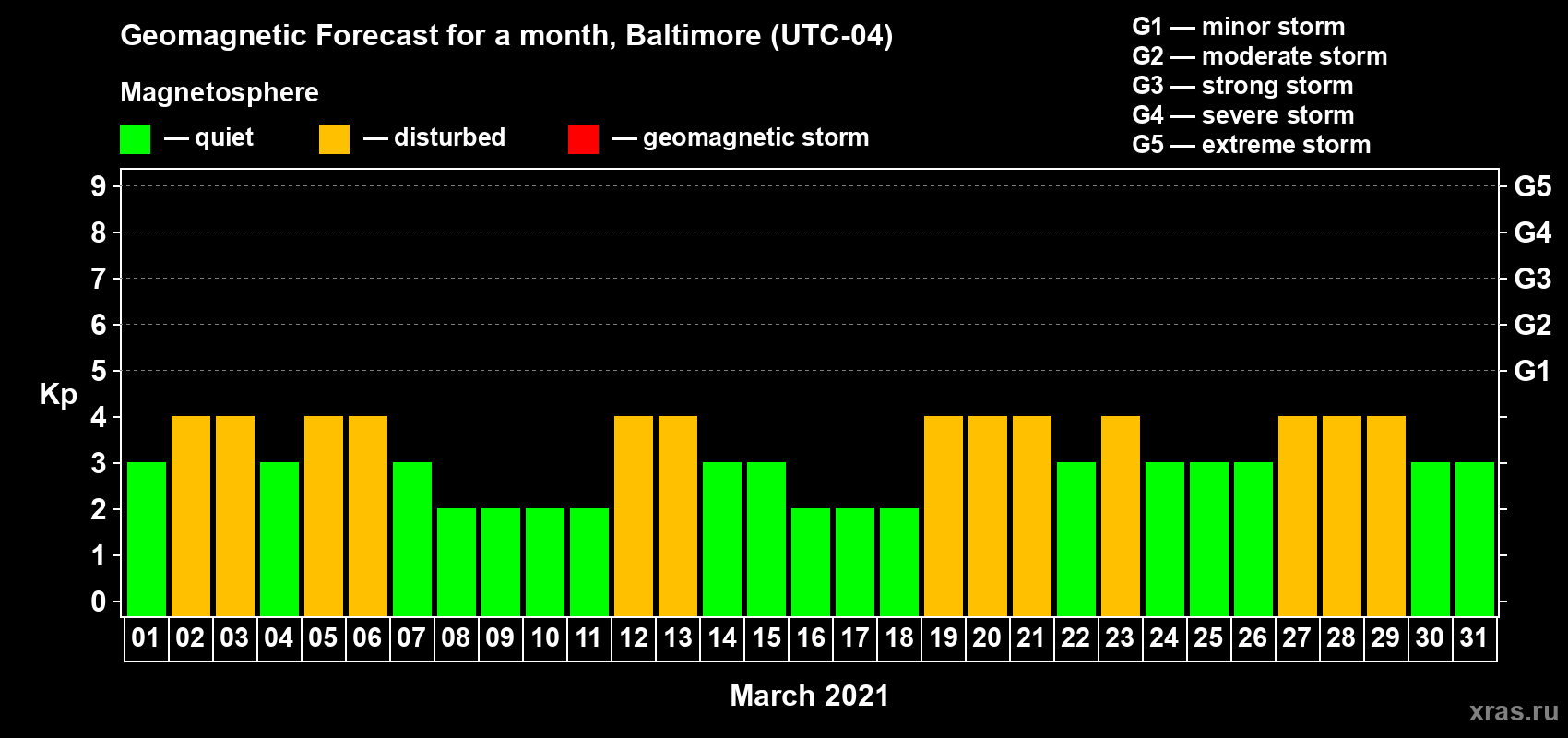 Geomagnetic storm forecast in Baltimore for Mar 01, 2021