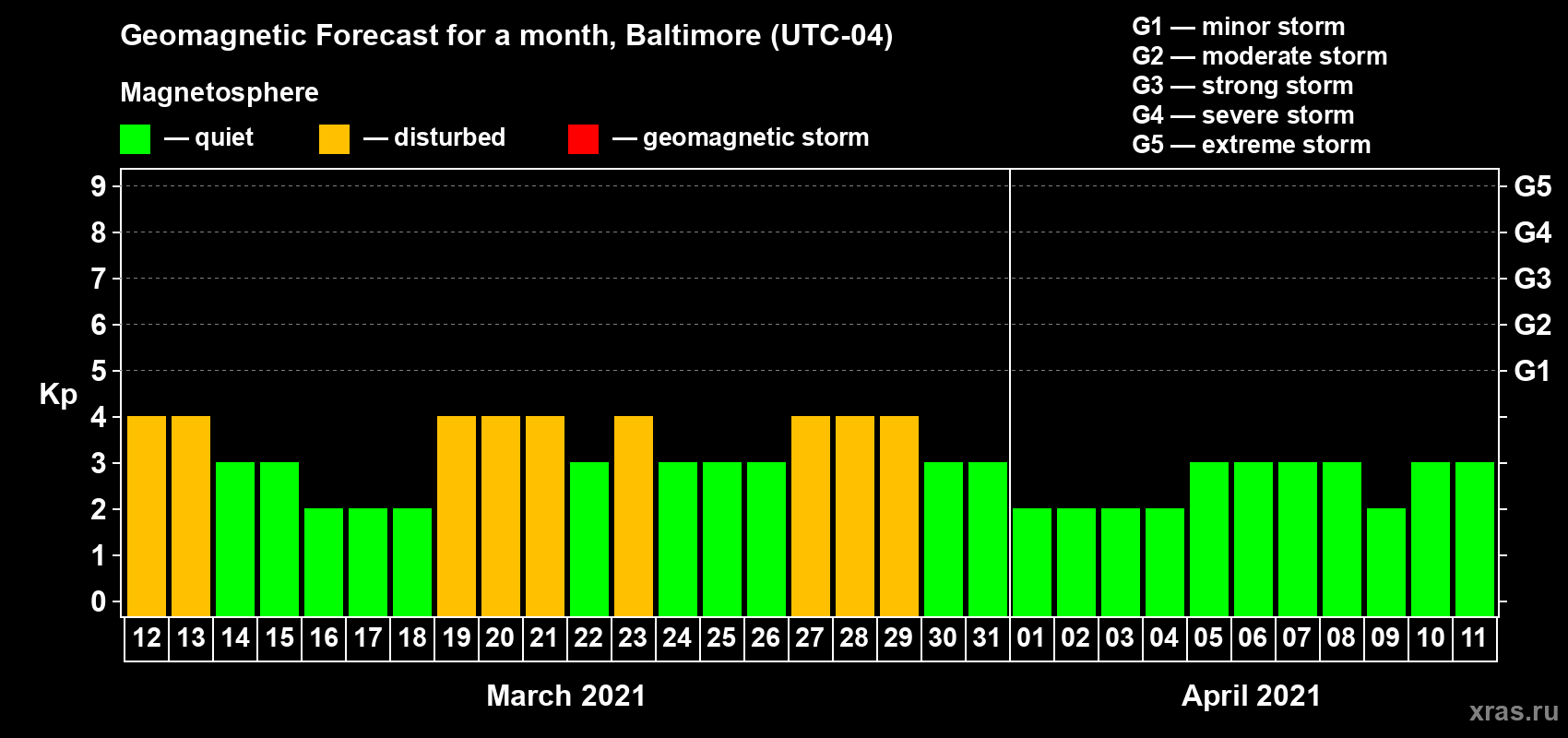 Geomagnetic storm forecast in Baltimore for Mar 12, 2021