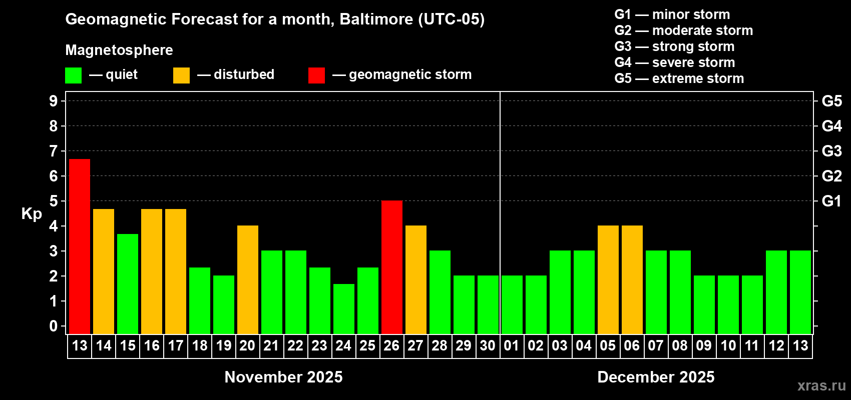 Geomagnetic storm forecast in Baltimore for Nov 13, 2025