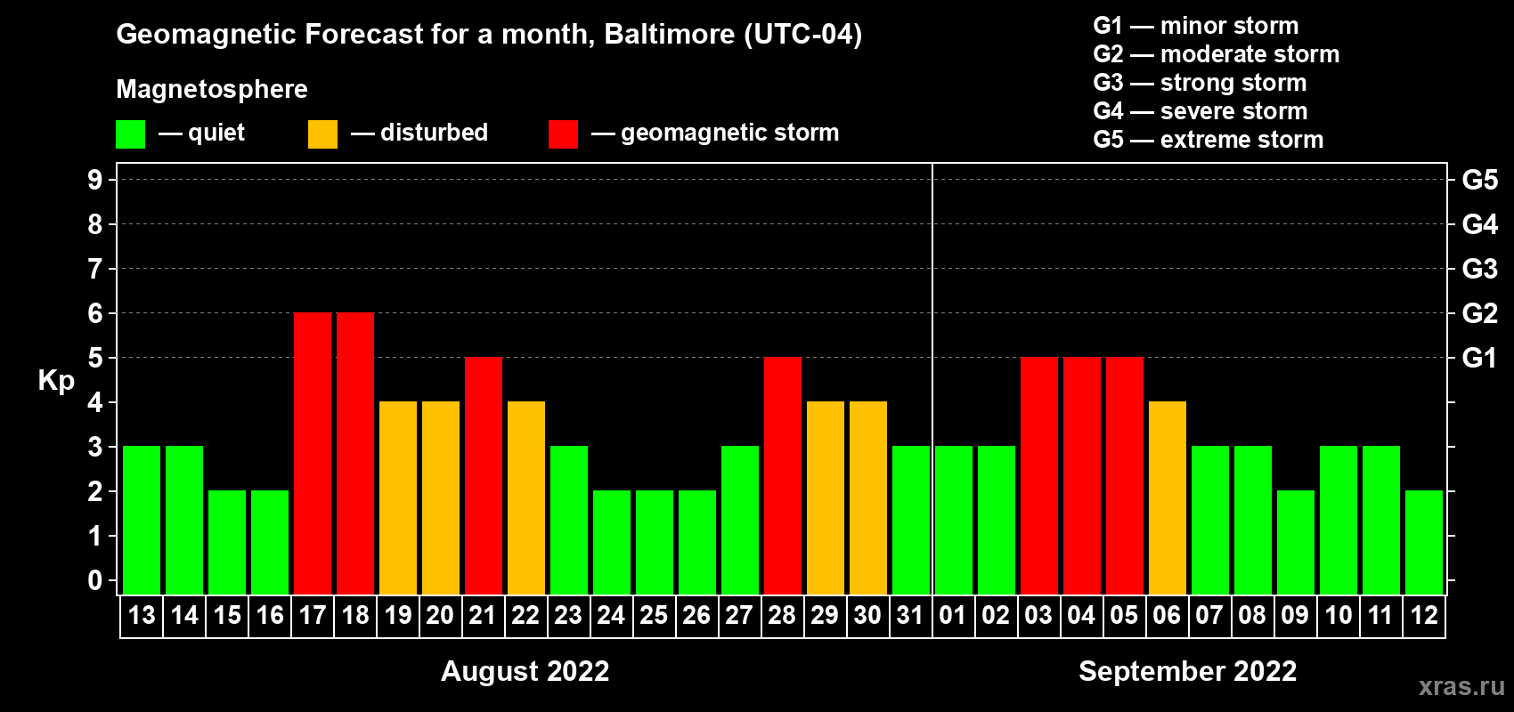 Geomagnetic storm forecast in Baltimore for Aug 13, 2022