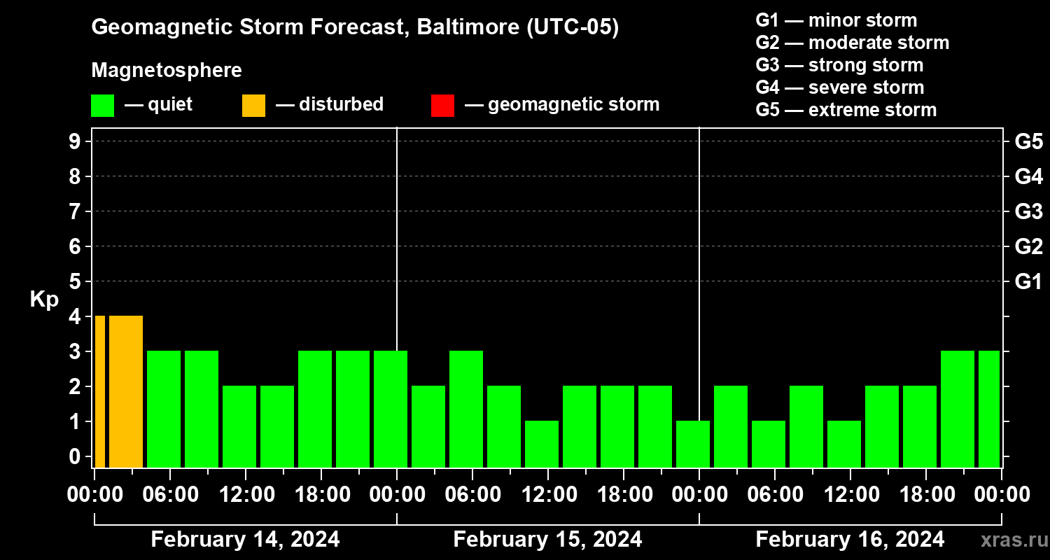 Geomagnetic storm forecast in Baltimore for Feb 14, 2024