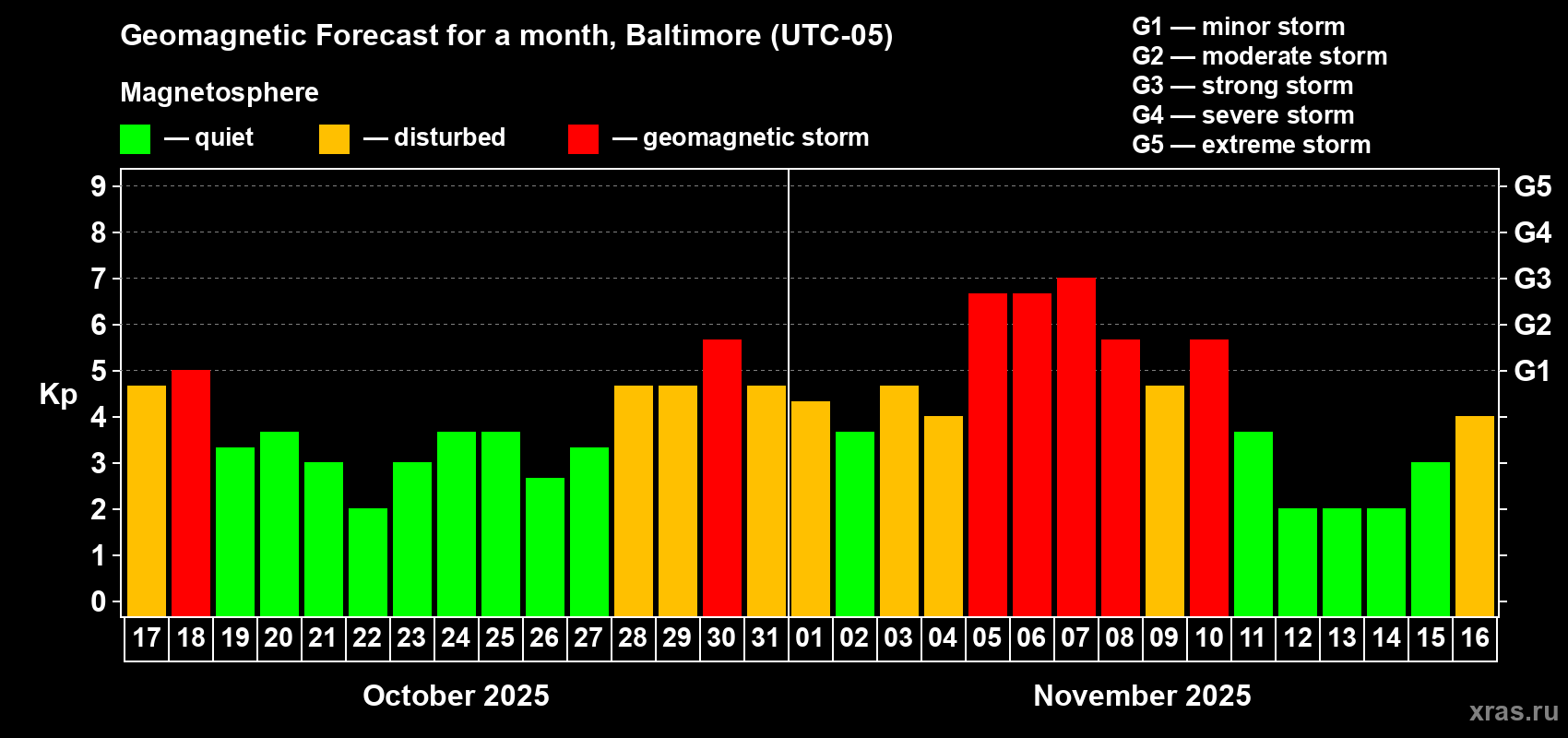 Geomagnetic storm forecast in Baltimore for Oct 17, 2025