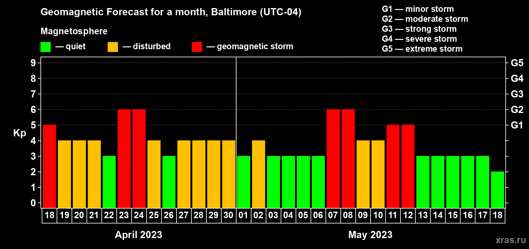 Geomagnetic storm forecast in Baltimore for Apr 18, 2023