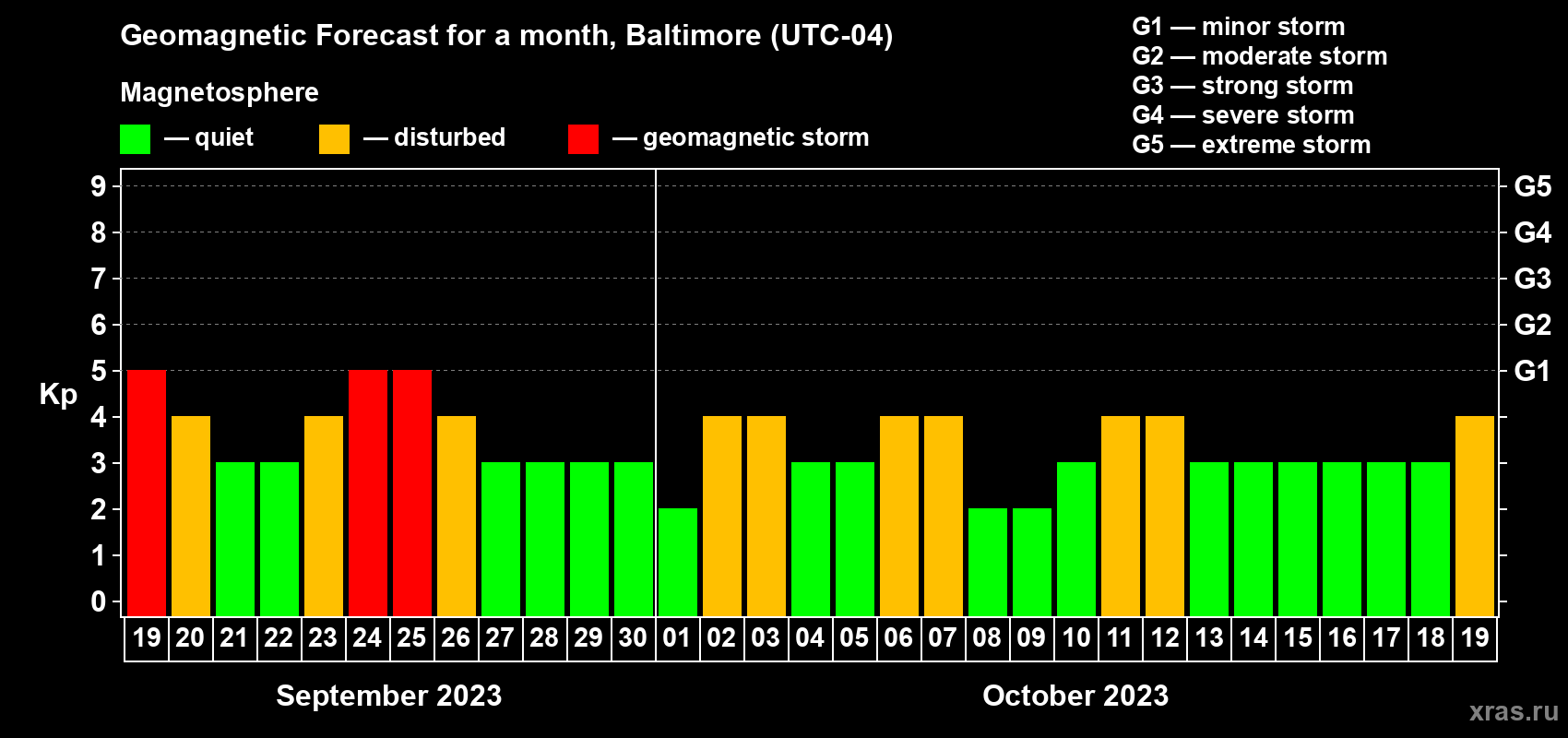 Geomagnetic storm forecast in Baltimore for Sep 19, 2023