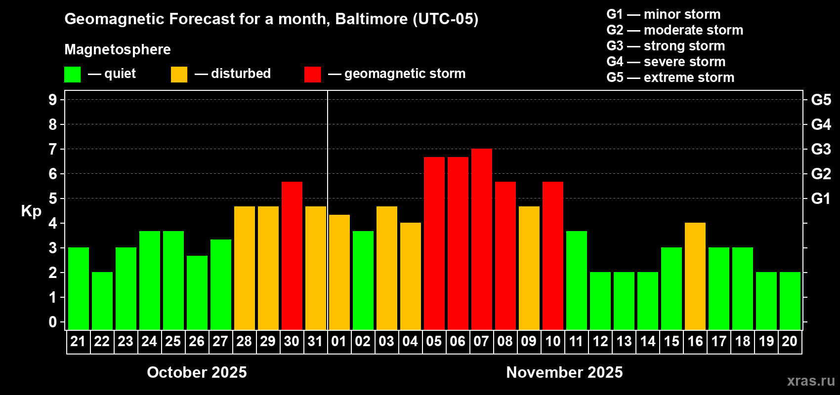 Geomagnetic storm forecast in Baltimore for Oct 21, 2025