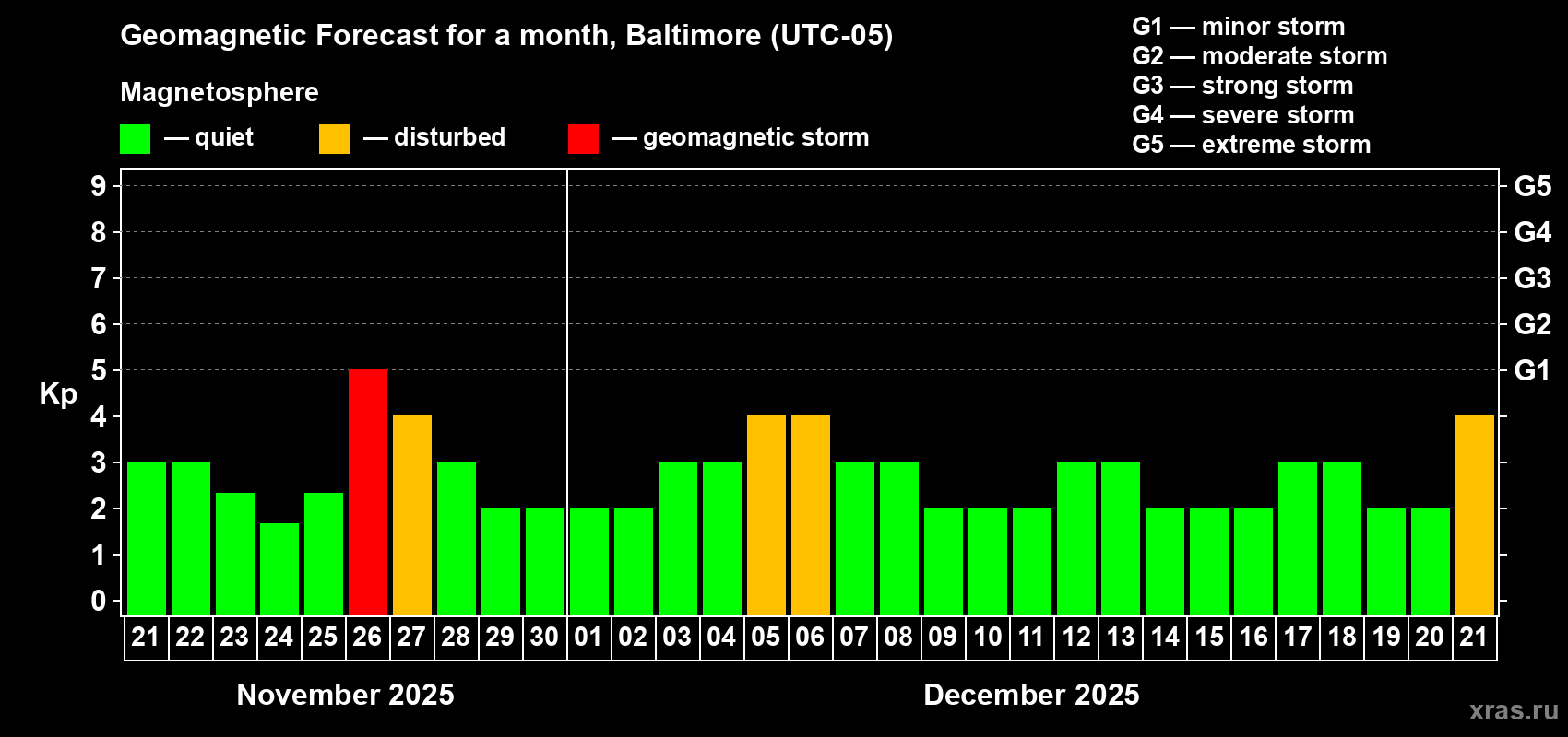 Geomagnetic storm forecast in Baltimore for Nov 21, 2025