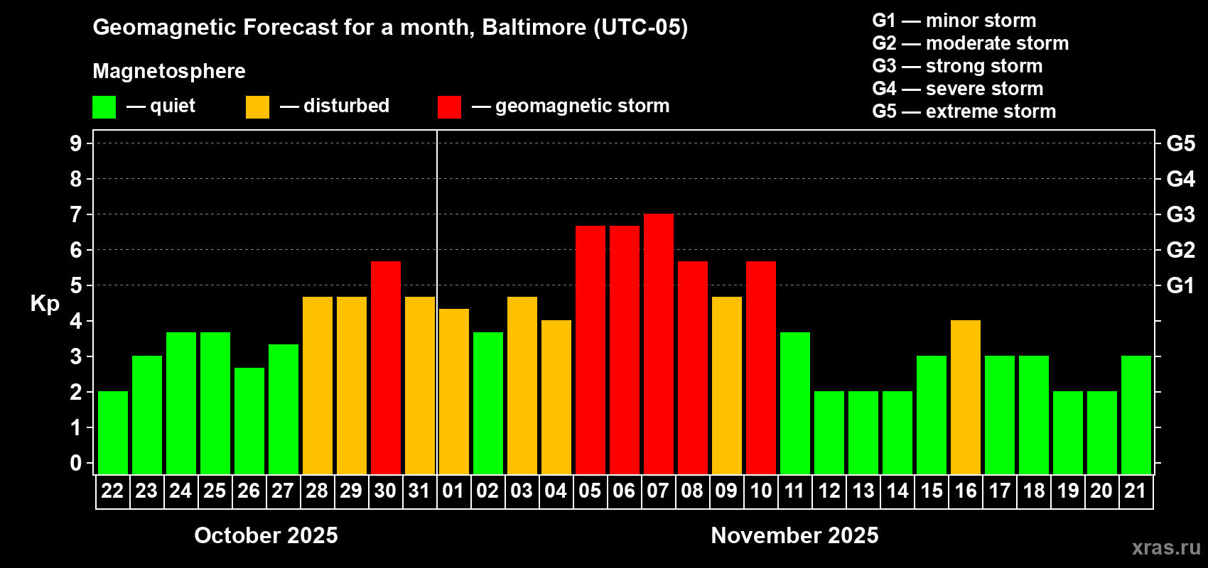 Geomagnetic storm forecast in Baltimore for Oct 22, 2025