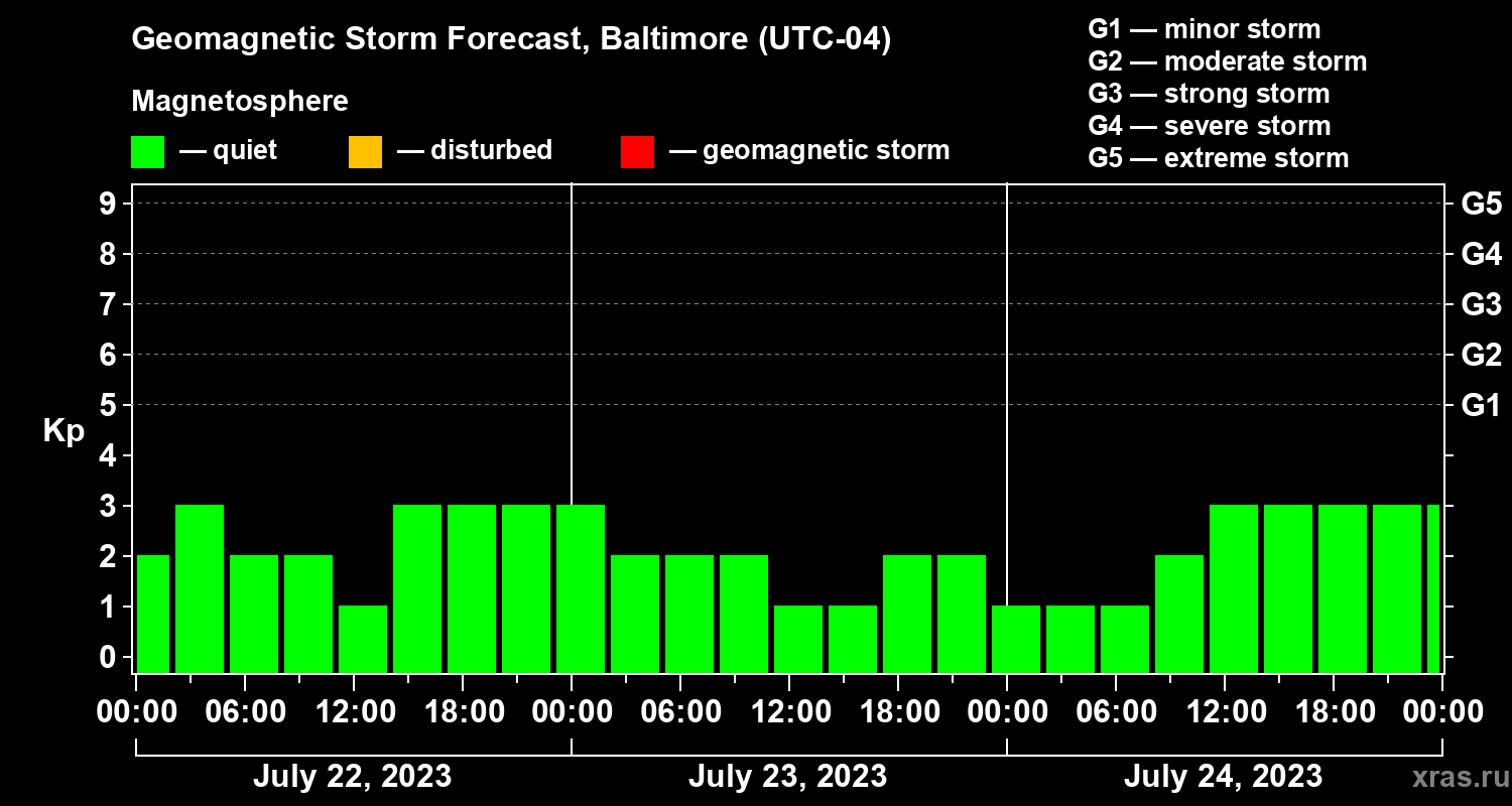 Geomagnetic storm forecast in Baltimore for Jul 22, 2023
