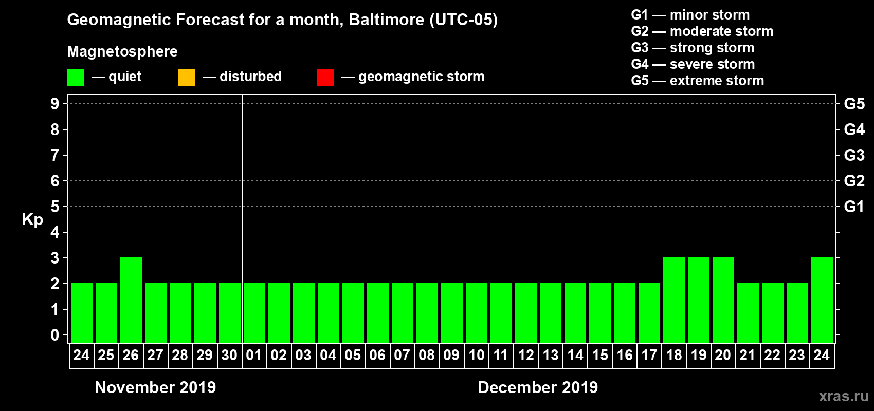 Geomagnetic storm forecast in Baltimore for Nov 24, 2019