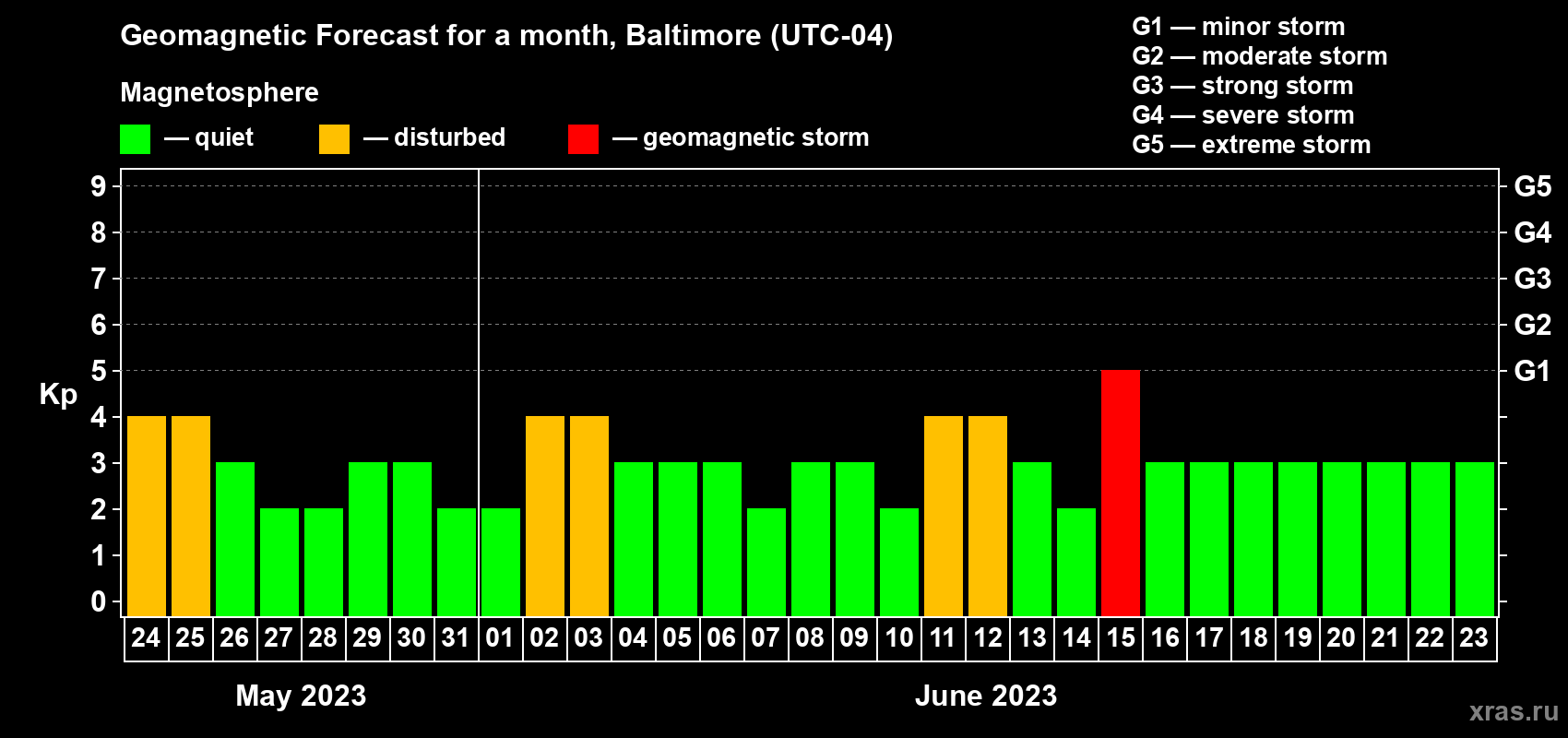 Geomagnetic storm forecast in Baltimore for May 24, 2023
