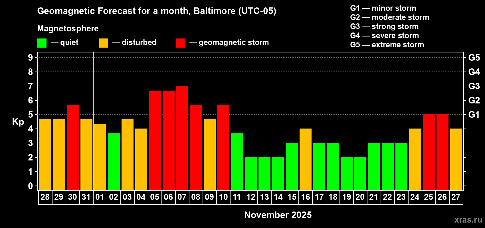 Geomagnetic storm forecast in Baltimore for Oct 28, 2025