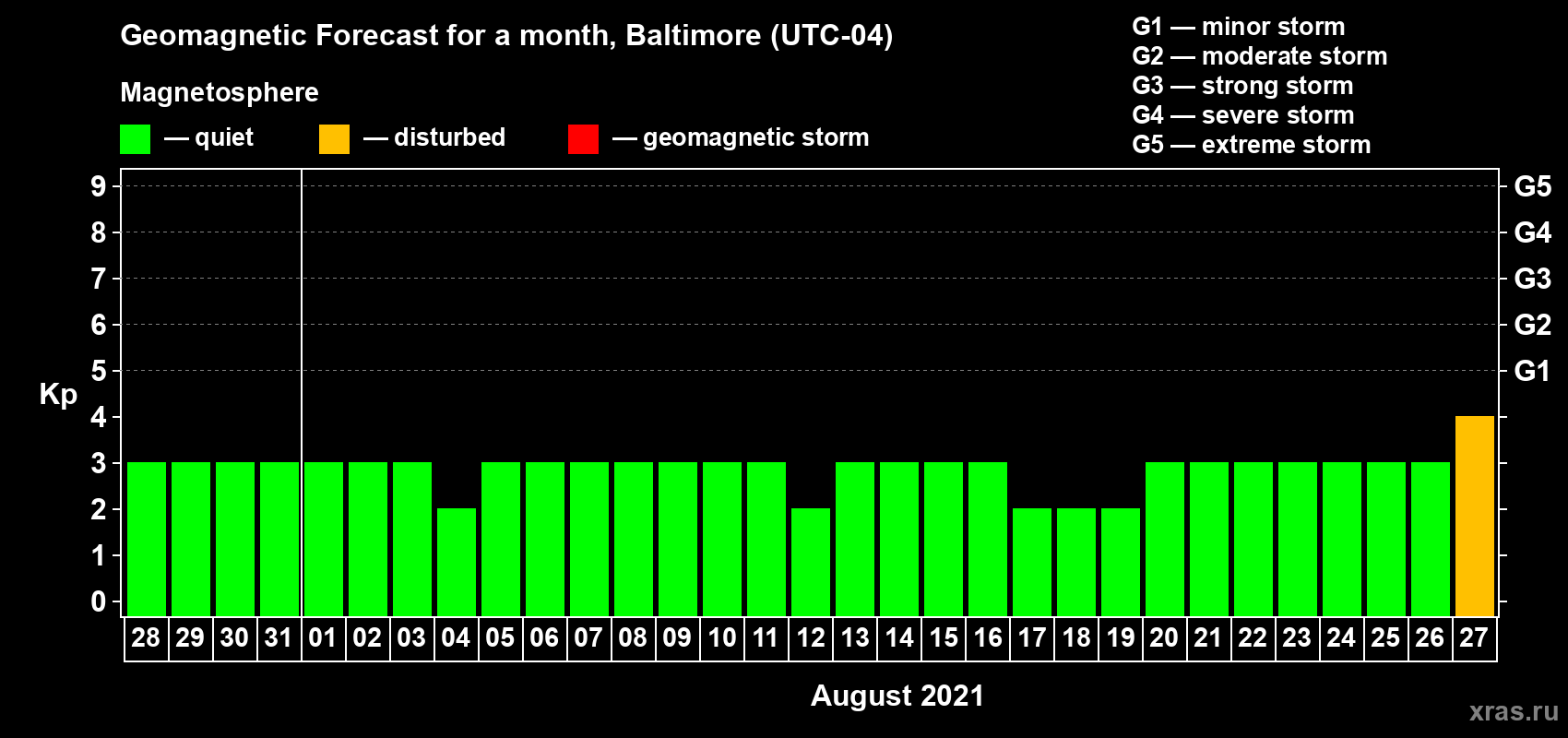 Geomagnetic storm forecast in Baltimore for Jul 28, 2021