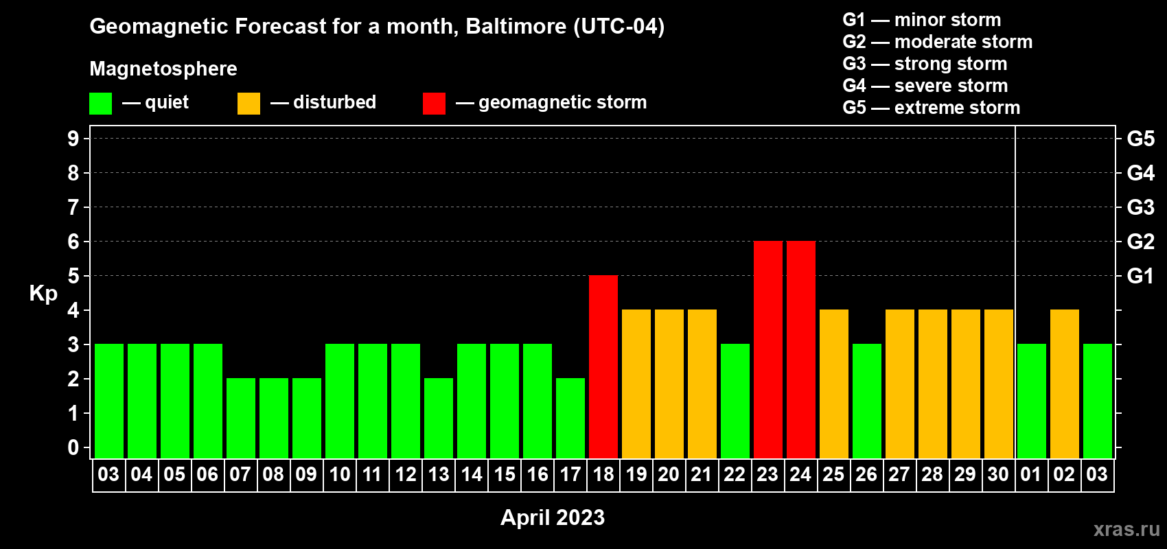 Geomagnetic storm forecast in Baltimore for Apr 03, 2023