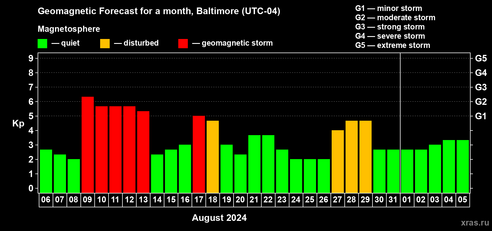 Geomagnetic storm forecast in Baltimore for Aug 06, 2024