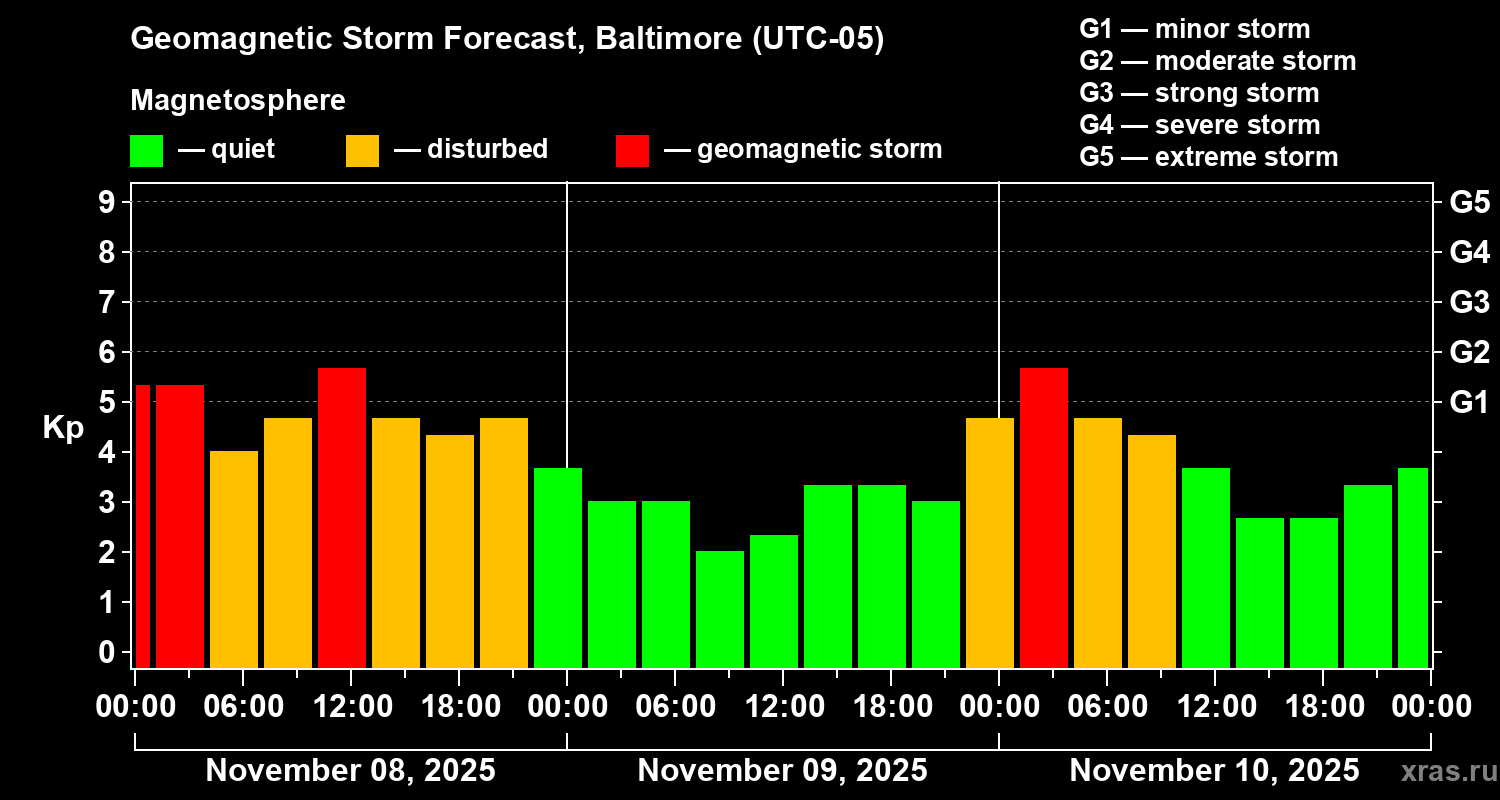 Geomagnetic storm forecast in Baltimore for Nov 08, 2025