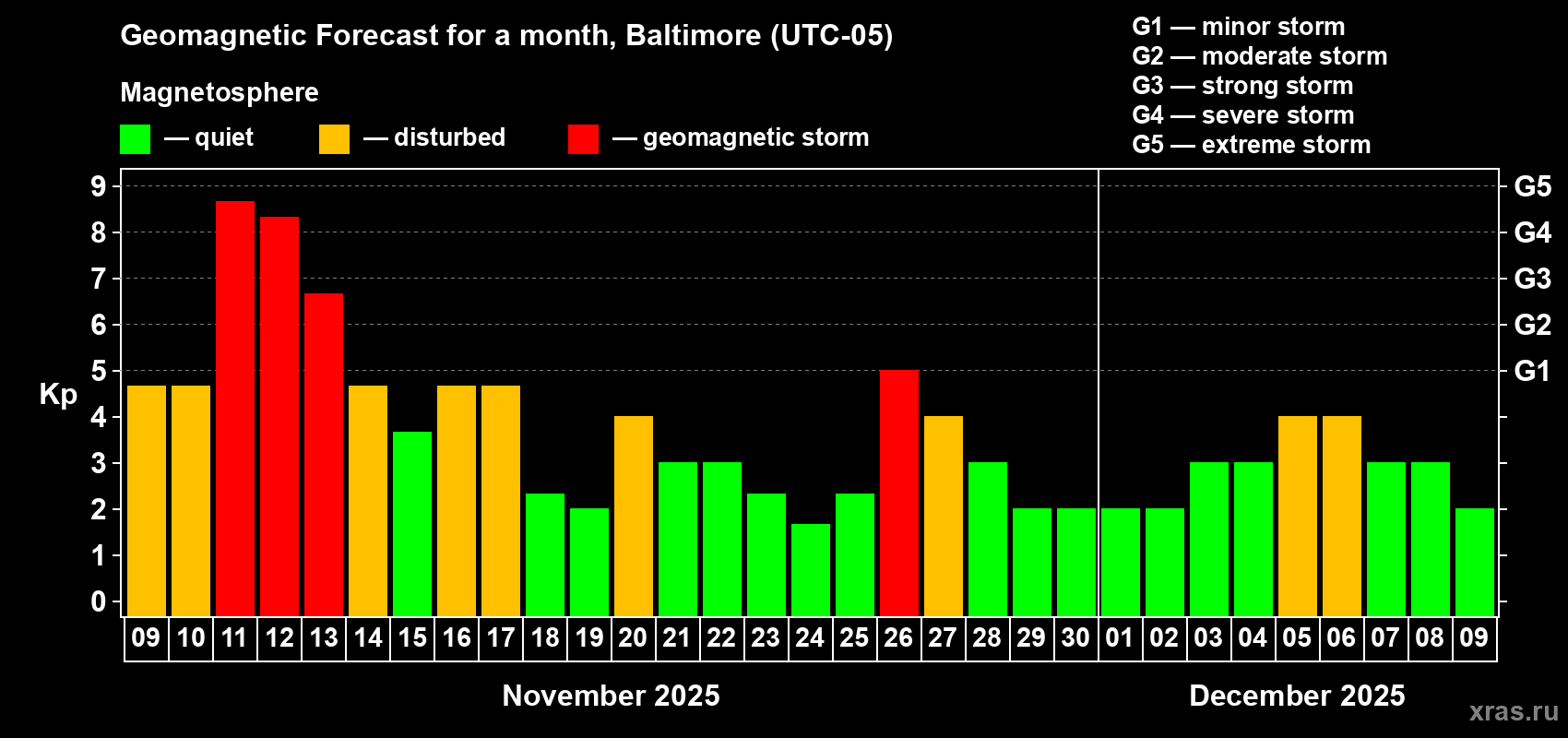 Geomagnetic storm forecast in Baltimore for Nov 09, 2025