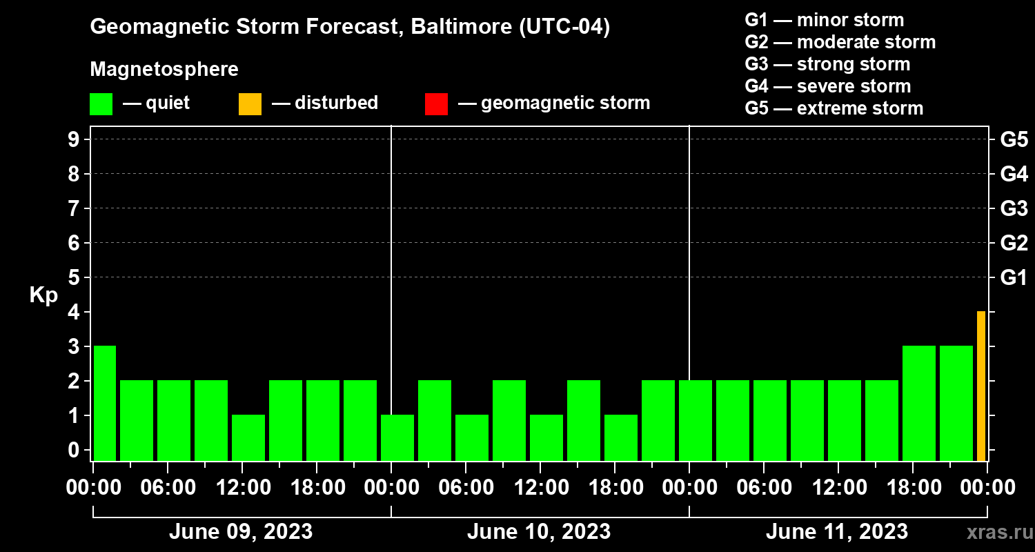 Geomagnetic storm forecast in Baltimore for Jun 09, 2023