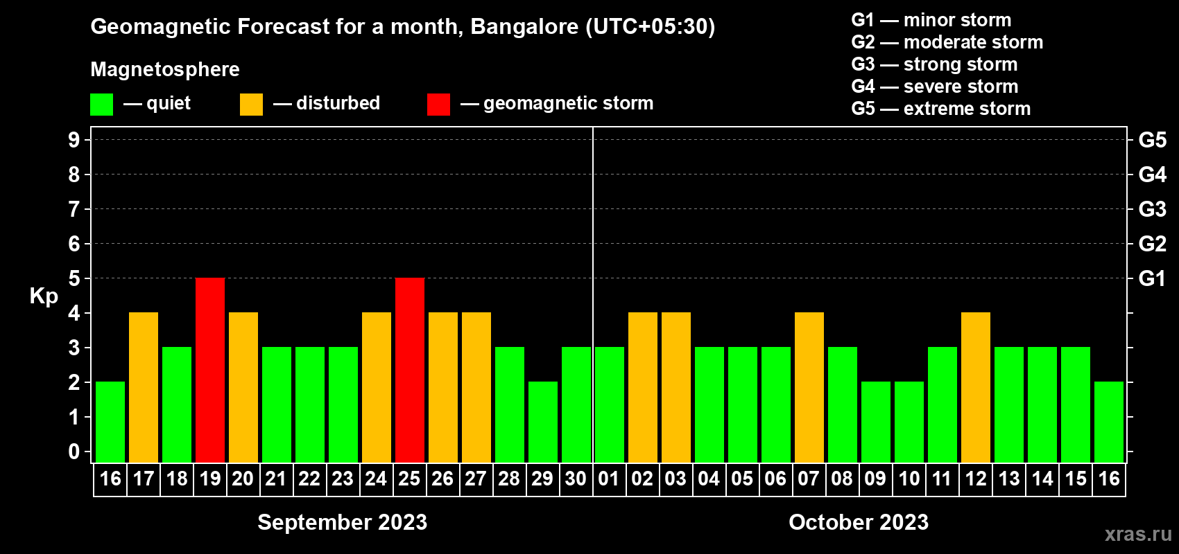 Geomagnetic storm forecast in Bangalore for Sep 16, 2023