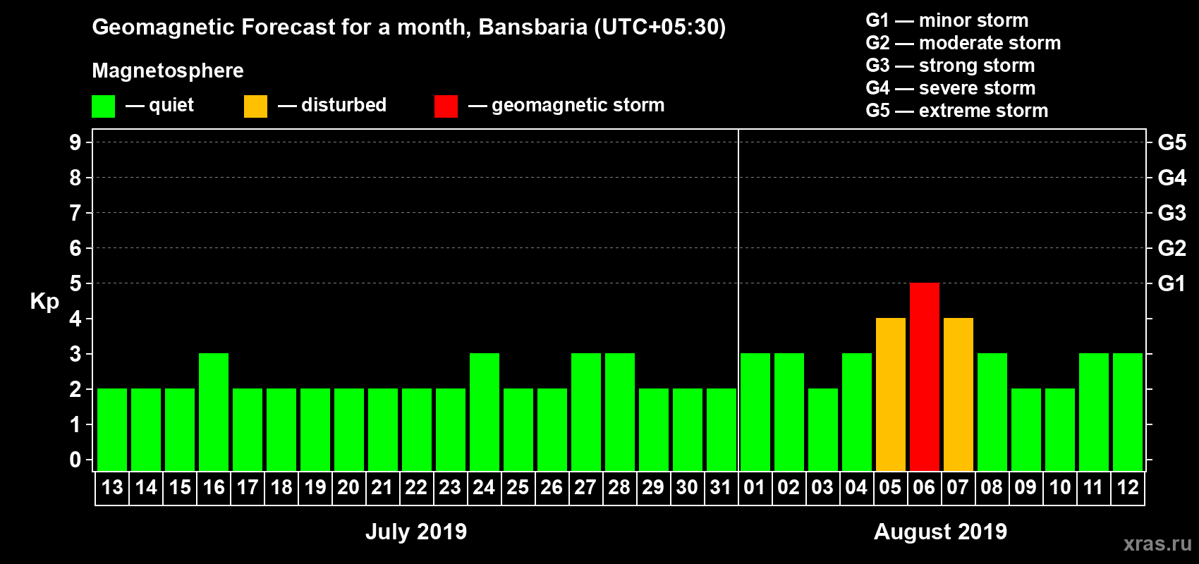 Geomagnetic storm forecast in Bansbaria for Jul 13, 2019