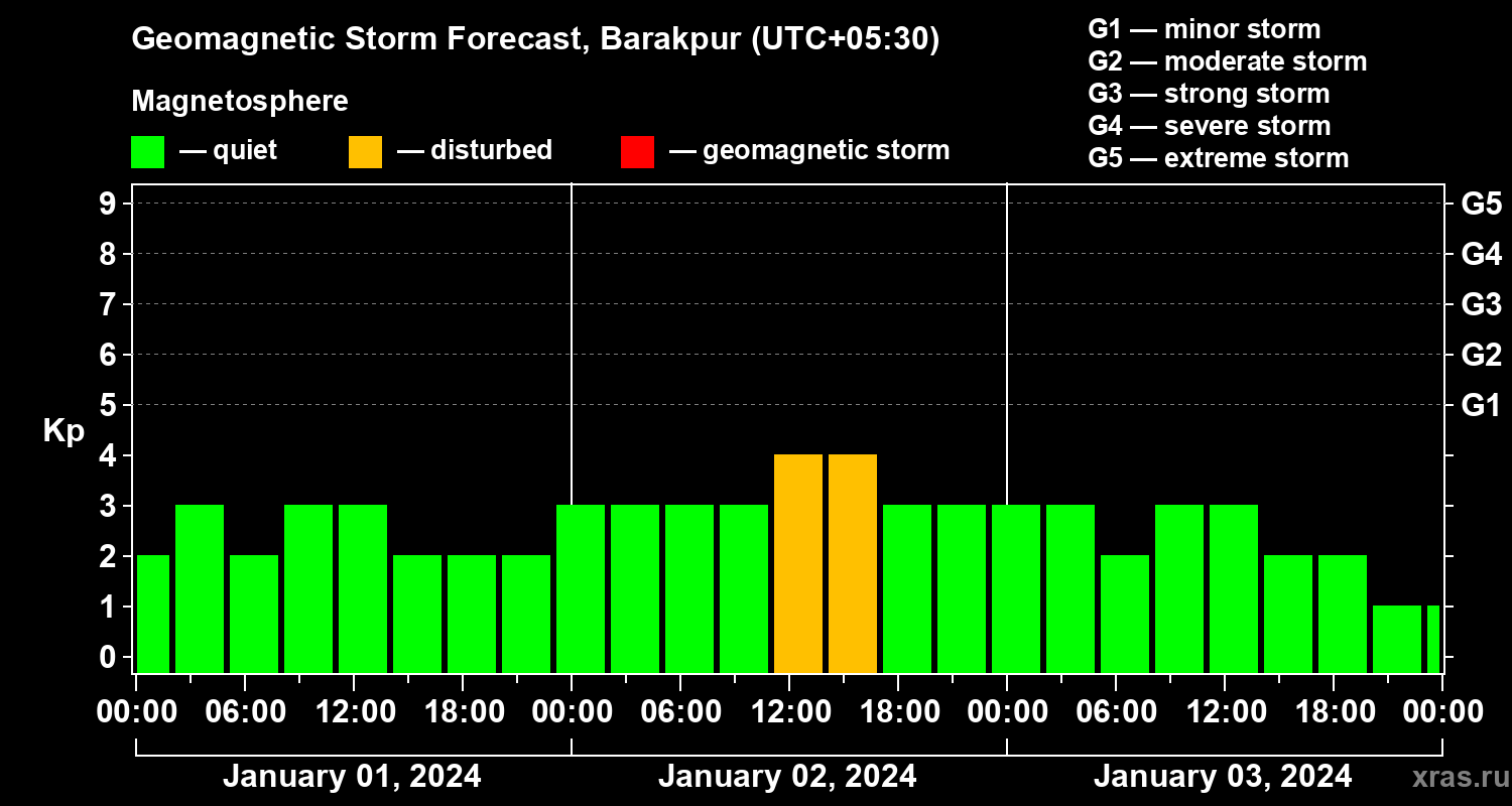 Geomagnetic storm forecast in Barakpur for Jan 01, 2024