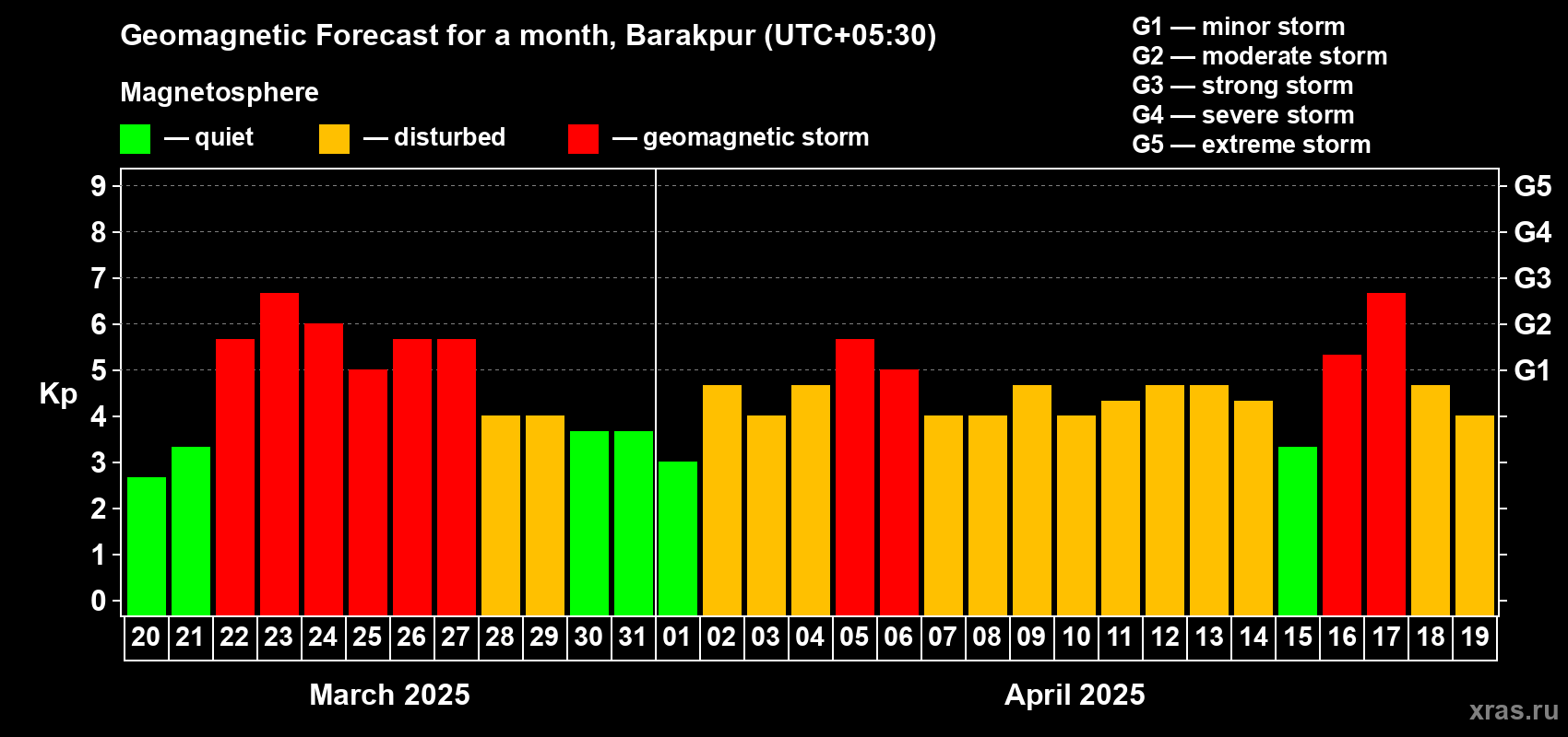 Geomagnetic storm forecast in Barakpur for Mar 20, 2025
