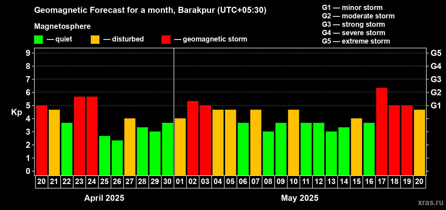 Geomagnetic storm forecast in Barakpur for Apr 20, 2025