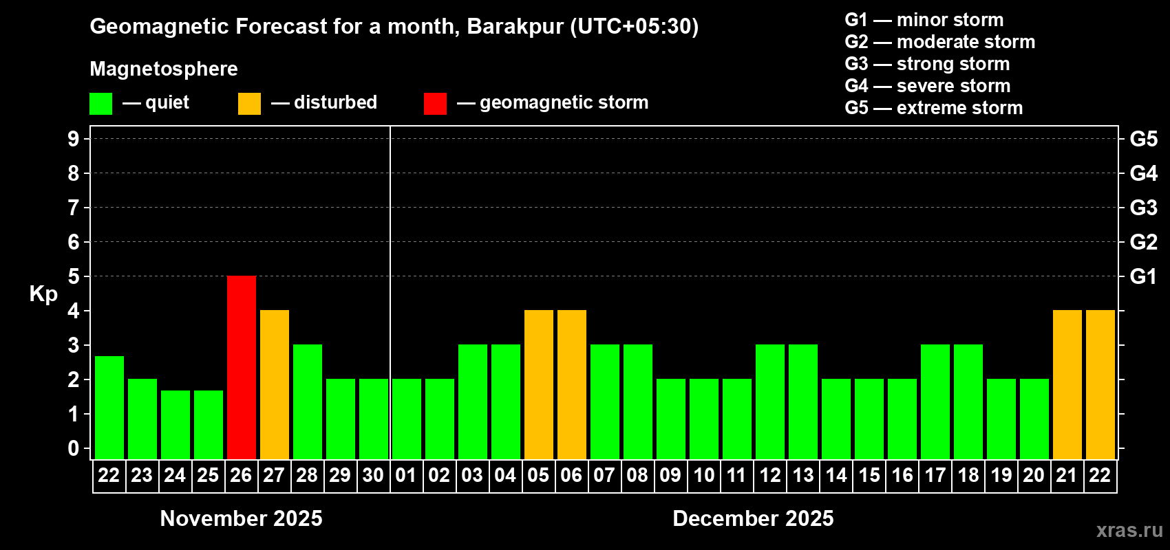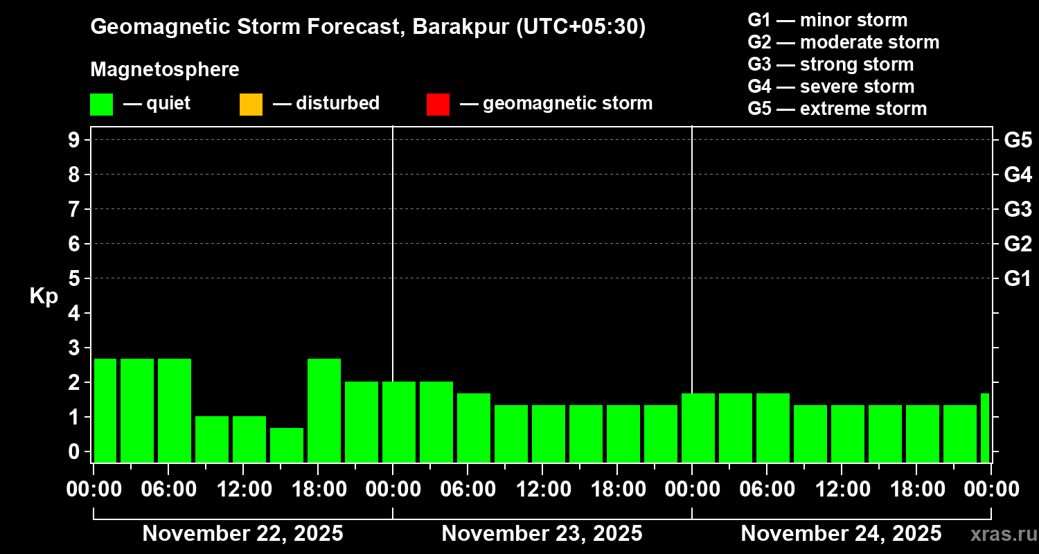 Geomagnetic storm forecast in Barakpur for Nov 22, 2025