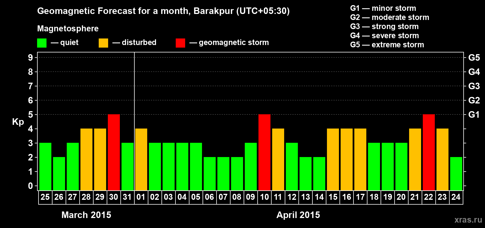 Geomagnetic storm forecast in Barakpur for Mar 25, 2015