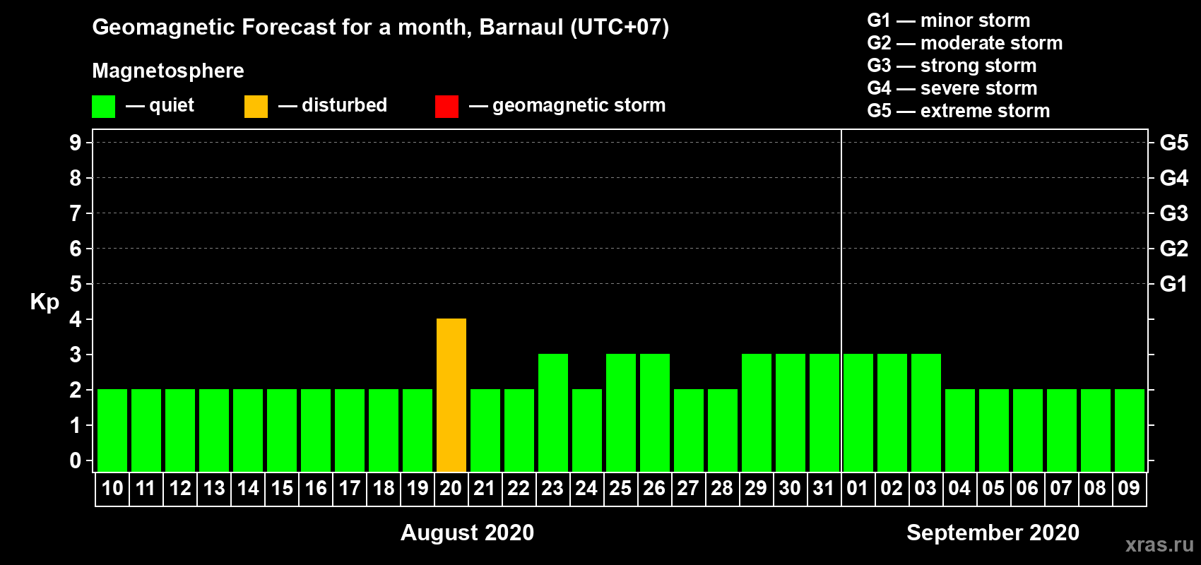 Geomagnetic storm forecast in Barnaul for Aug 10, 2020