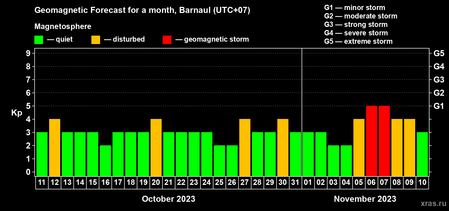 Geomagnetic storm forecast in Barnaul for Oct 11, 2023