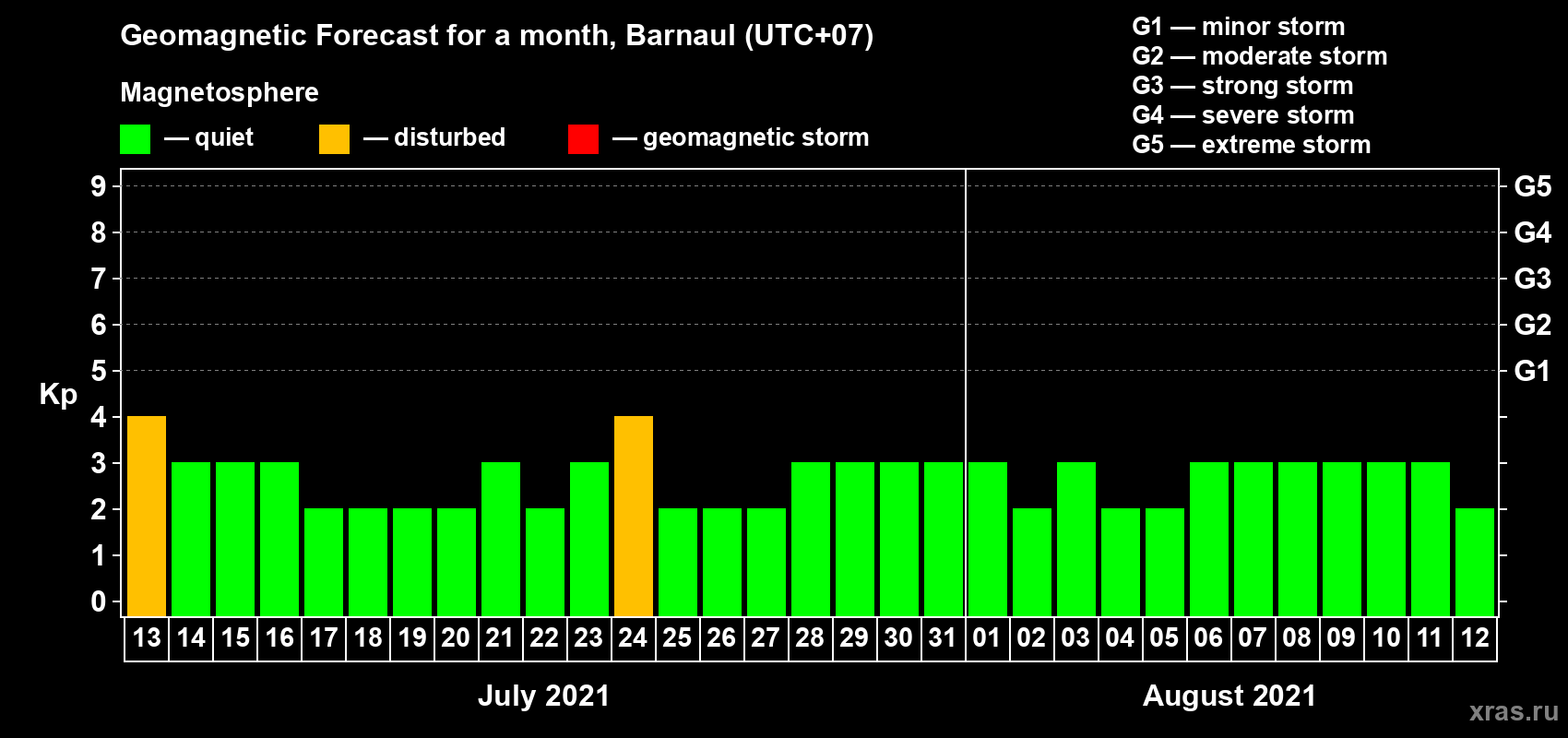 Geomagnetic storm forecast in Barnaul for Jul 13, 2021