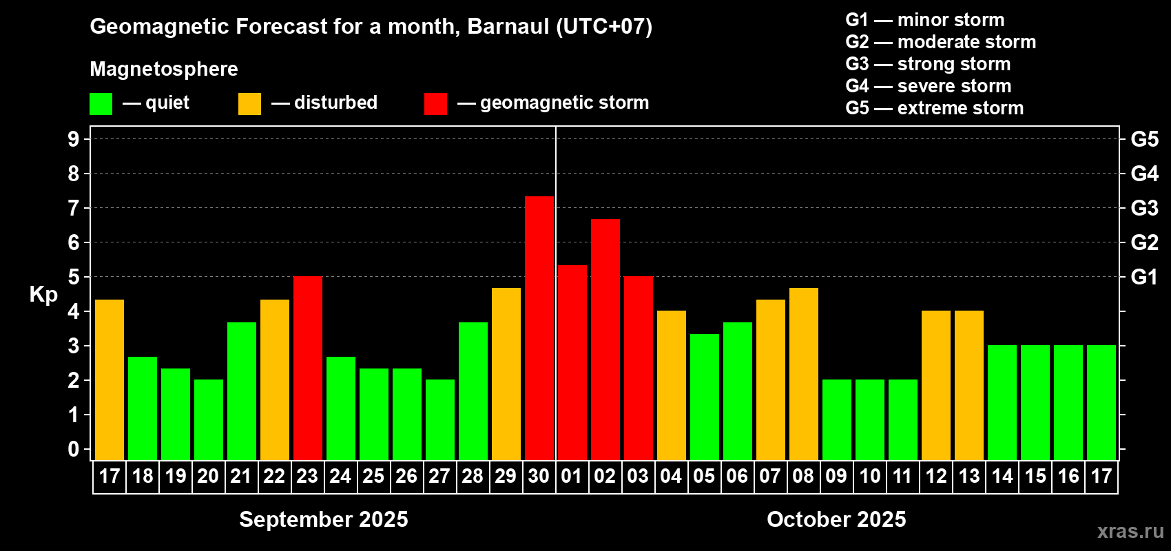 Geomagnetic storm forecast in Barnaul for Sep 17, 2025