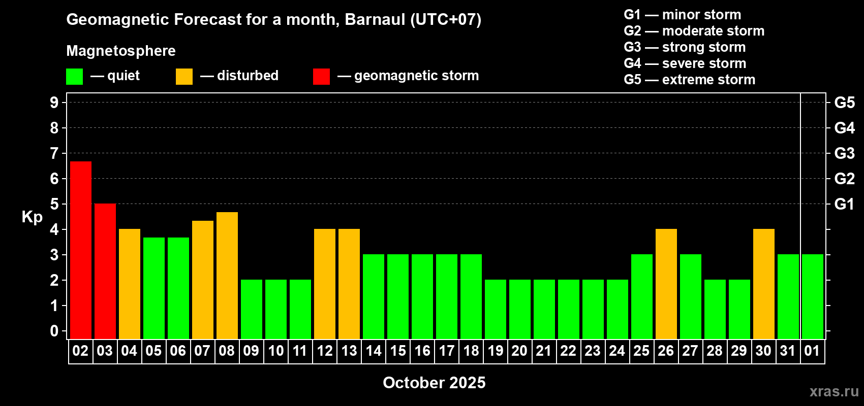 Geomagnetic storm forecast in Barnaul for Oct 02, 2025