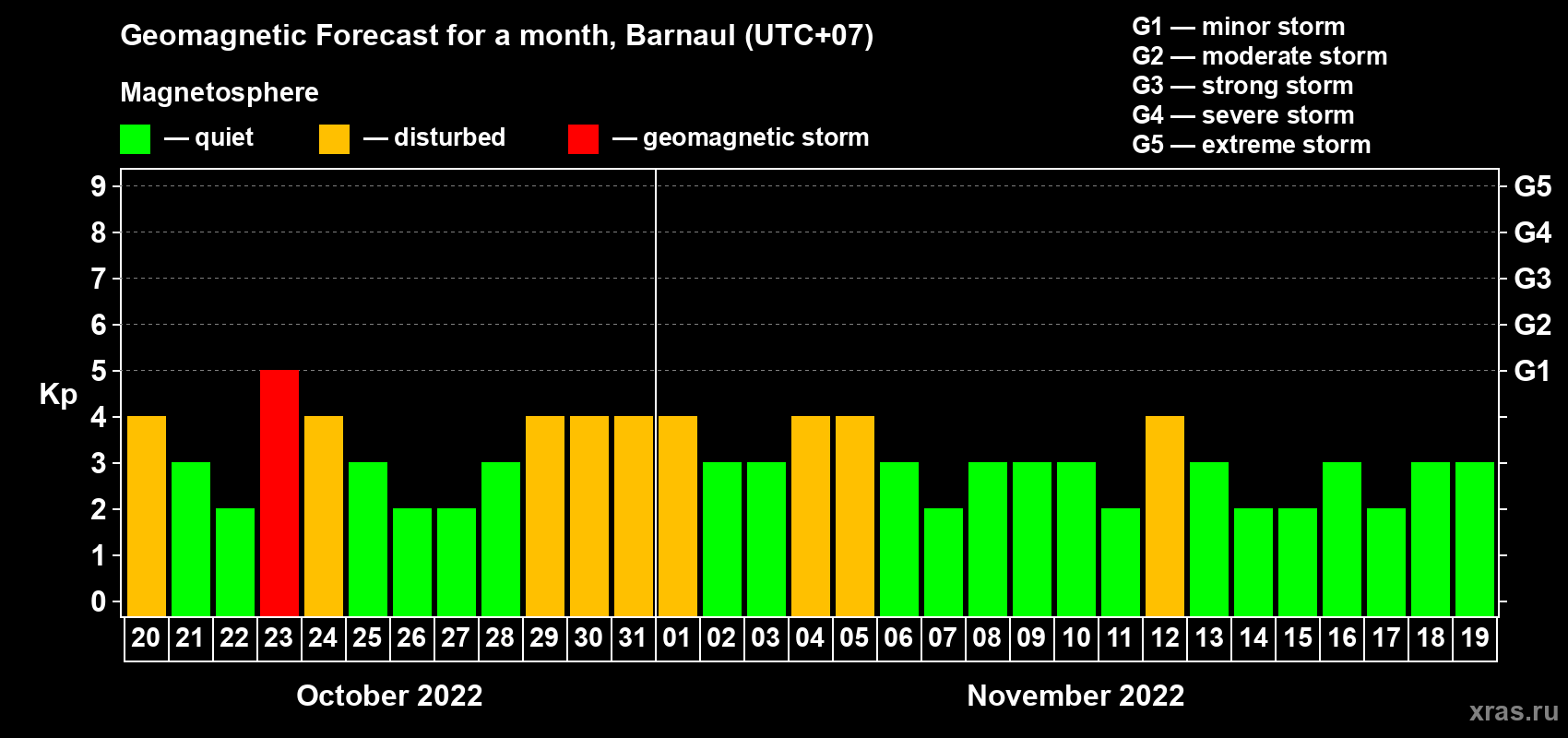 Geomagnetic storm forecast in Barnaul for Oct 20, 2022