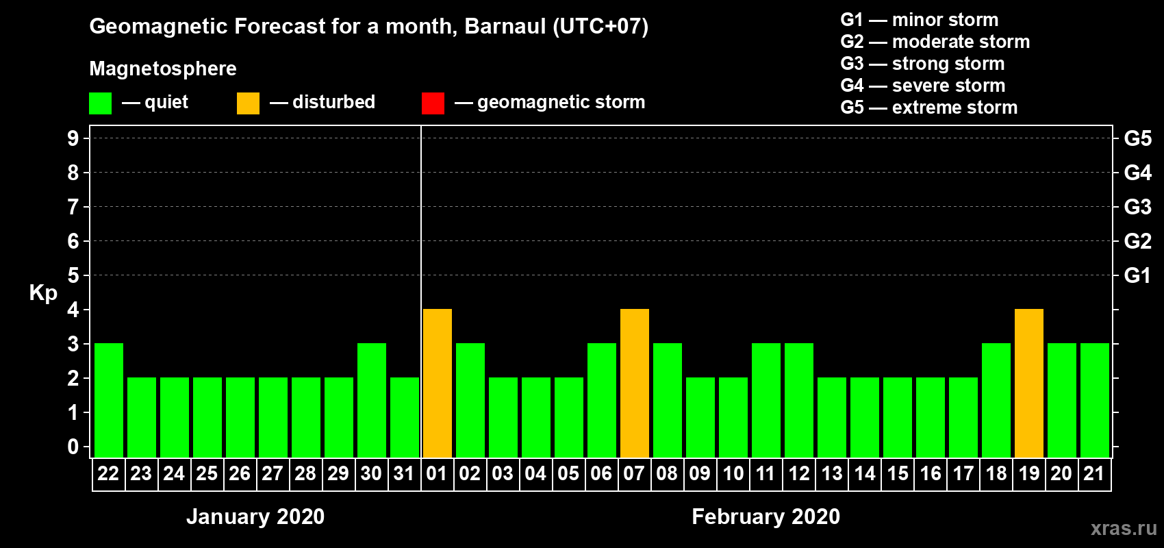 Geomagnetic activity forecast in Barnaul — Jan 22, 2020