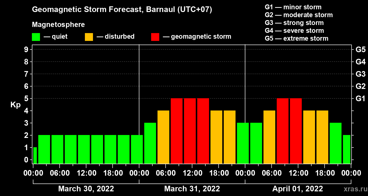 Geomagnetic storm forecast in Barnaul for Mar 30, 2022