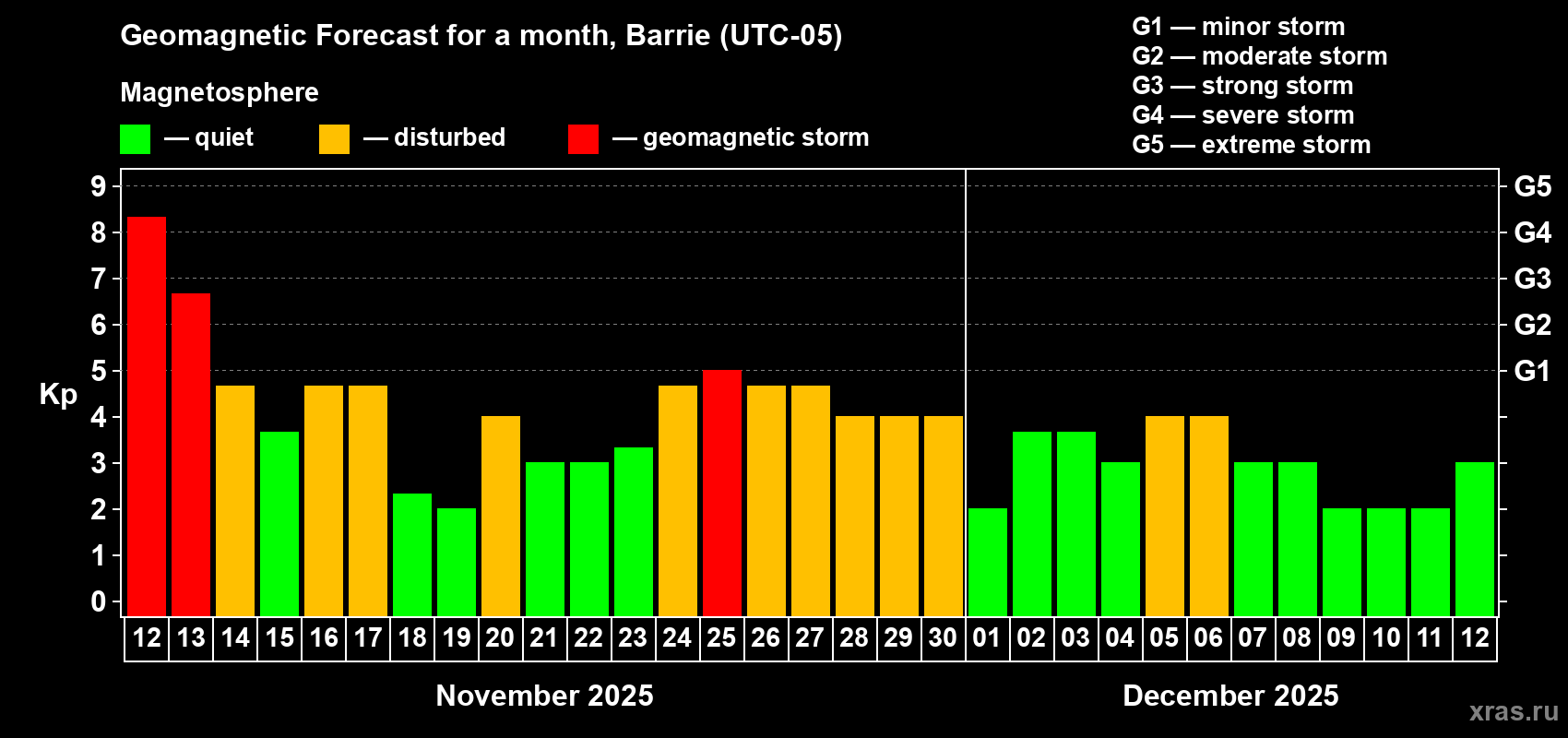 Geomagnetic storm forecast in Barrie for Nov 12, 2025
