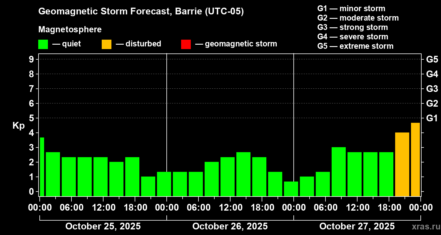 Geomagnetic storm forecast in Barrie for Oct 25, 2025